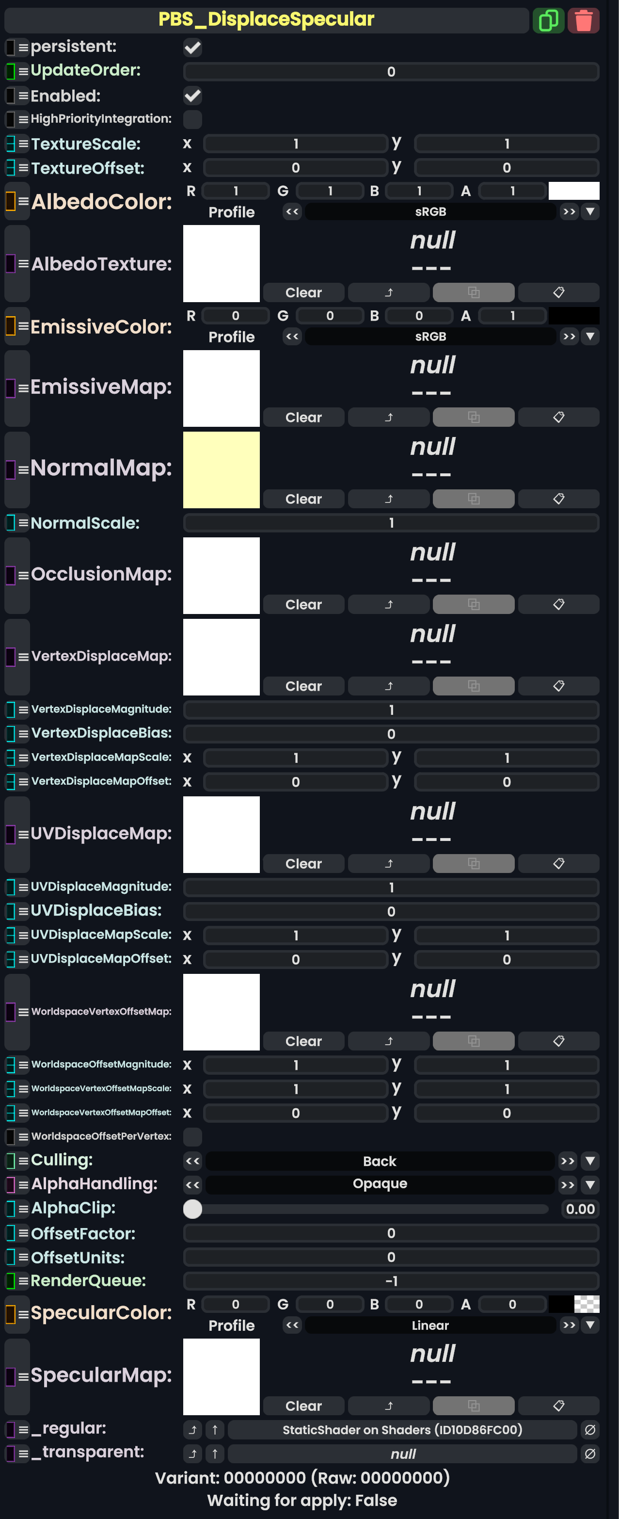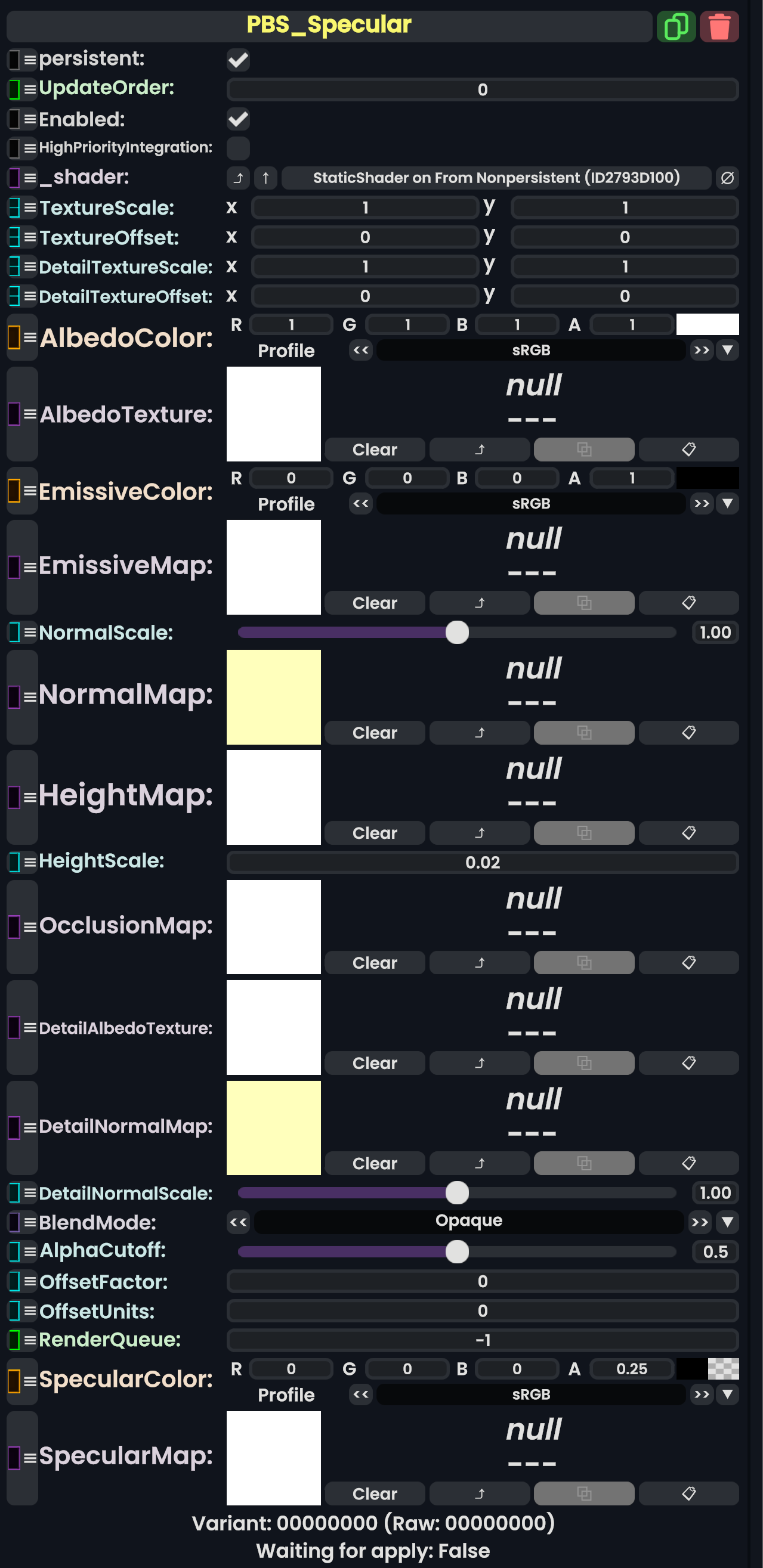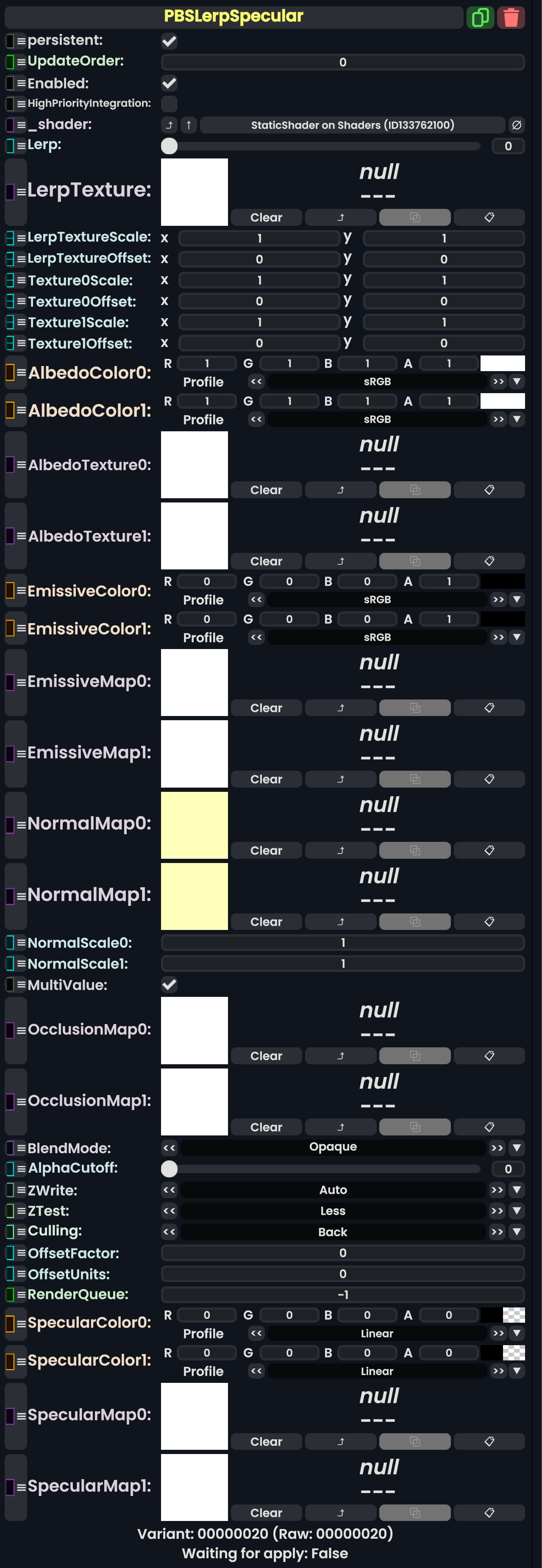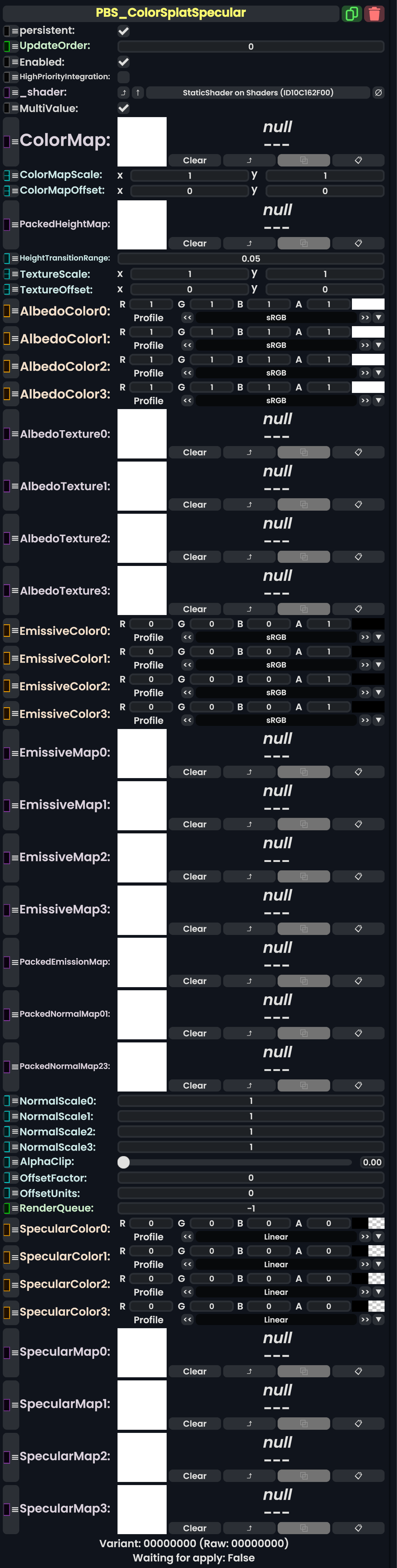 | 05:37, 12 February 2024 | PBS ColorSplatSpecularComponent.png (file) | 757 KB | AmasterAmaster (talk | contribs) | Image that shows the "PBS_ColorSplatSpecular" component. | 1 | |