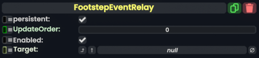 The '''FootstepEventRelay''' component can be put on a user's feet or an object with a collider to receive footstep events. The events are then sent to another slot or any number of [[ProtoFlux:FootstepEvents]] ProtoFlux nodes.