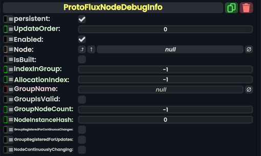 The '''ProtoFluxNodeDebugInfo''' component is used to gather Debug Info on a particular [[ProtoFlux]] node and it's group. | The '''ProtoFluxNodeDebugInfo''' component is used to gather Debug Info on a particular [[ProtoFlux]] node and it's group. | ||