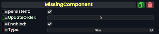 The MissingComponent component is used to signify that a component previously saved on a slot no longer exists inside of Resonite. seeing this component is rare due to the backwards compatibility of Resonite. This component does not have any active functionality.