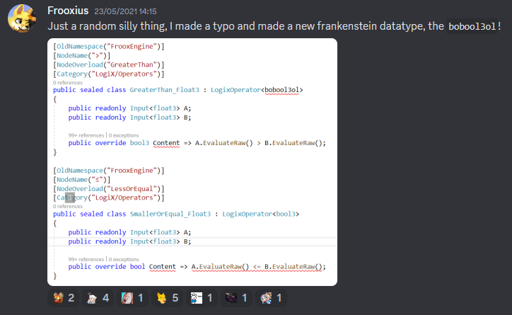 On a more serious note, this node originates from a typo that Frooxius made while implementing the vector comparison operator nodes. | |||
