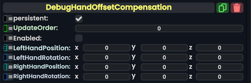 The '''DebugHandOffsetCompensation''' component constantly changes the mapping offsets of the left and right controllers with the values in its fields. These offsets determine how a controller is kept in a consistent orientation to other controllers a user can have.