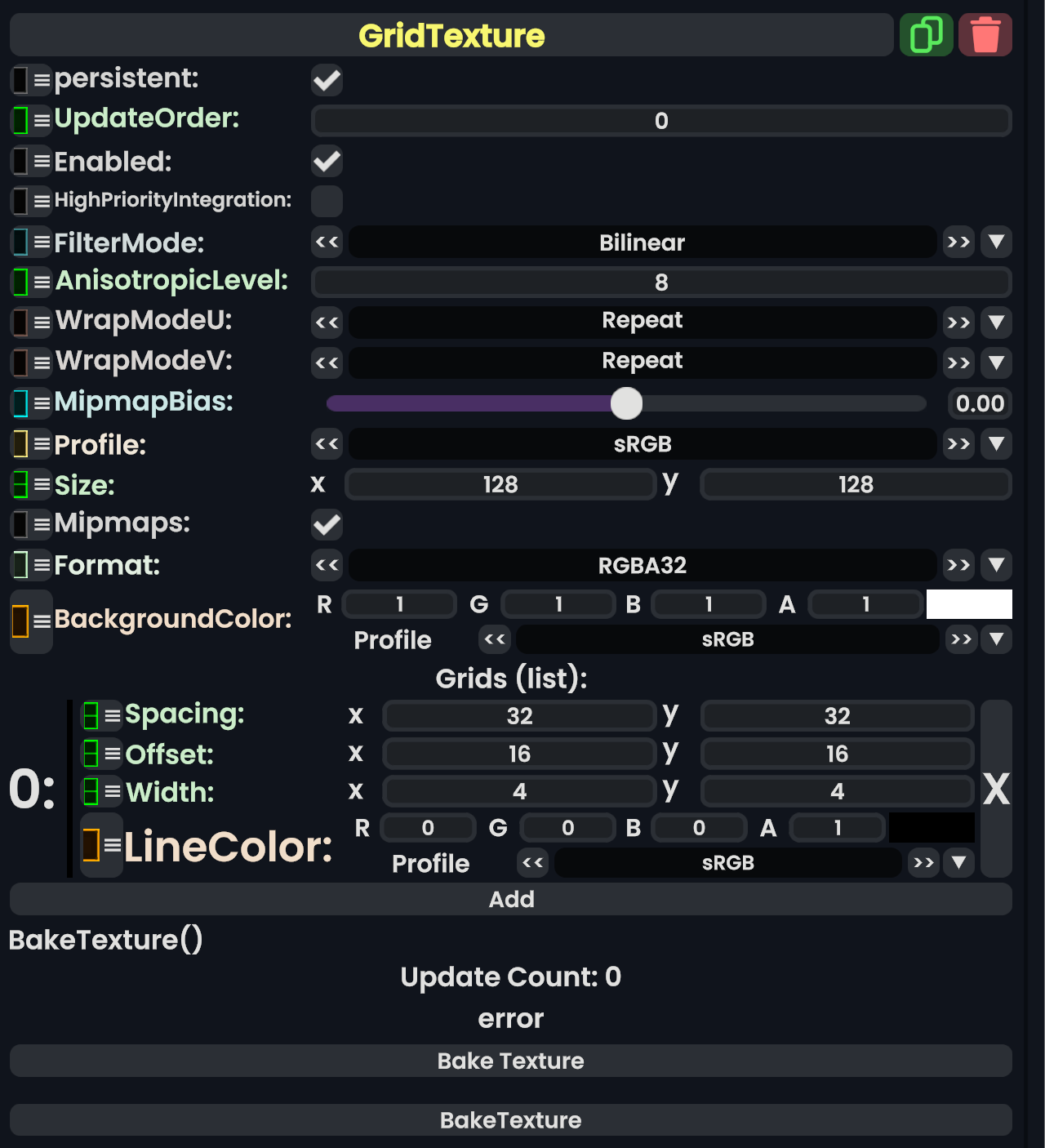 | 02:49, 11 February 2024 | GridTextureComponent.png (file) | 230 KB | AmasterAmaster (talk | contribs) | Image that shows the "GridTexture" component. | 1 | |