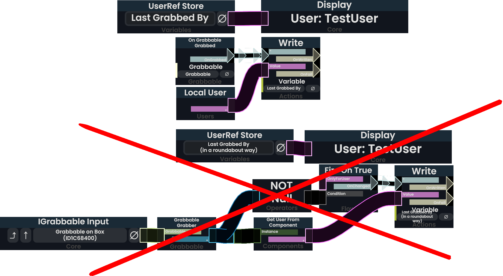 An example of On Grabbable Grabbed being used with a Local User (which is better) vs using a fire on not null using a Grabbable Grabber and having to use a user and having to check the grabber for who released it.