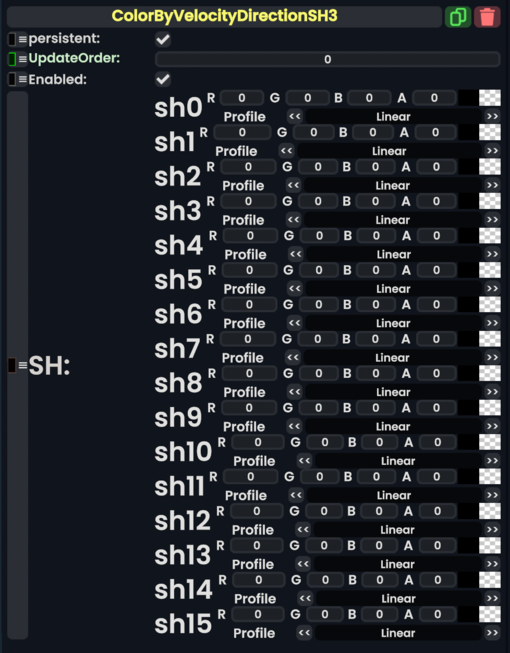 The Color By Velocity Direction SH3 component samples a ColorX spherical harmonic based on the velocity vector of a particle in it's simulation space. that sampled color becomes the particle's color.